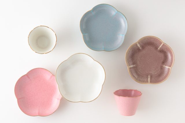 それぞれに表情が異なり、釉薬の変化を楽しめる結晶釉。晴れやかな白・赤、落ち着いた色調の青・茶、4種類の結晶釉で仕上げています。梅型の取皿や品のあるそば猪口でフチには金を施しています。