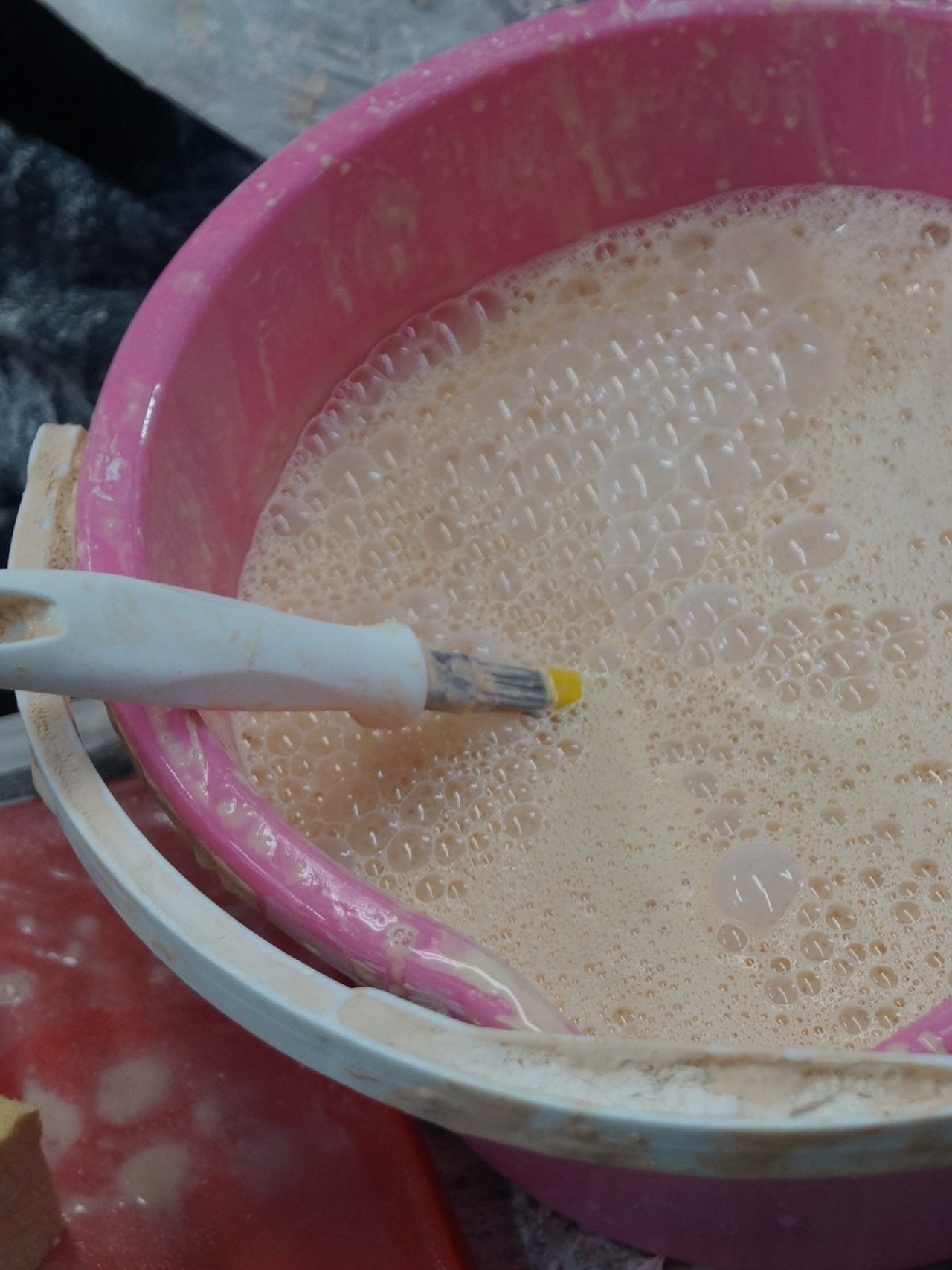 - 破損した素焼きを細かく砕き、ポットミルという道具を用いてペースト状にしたものを、釉薬に混ぜて泡だてます。