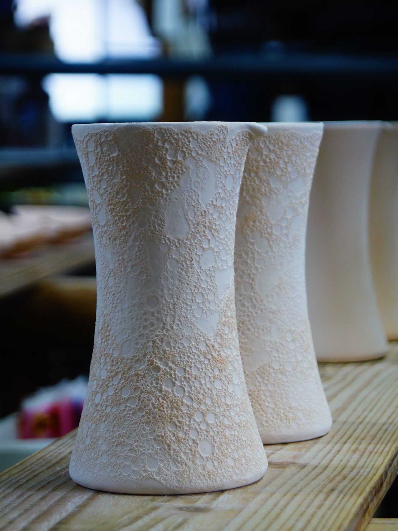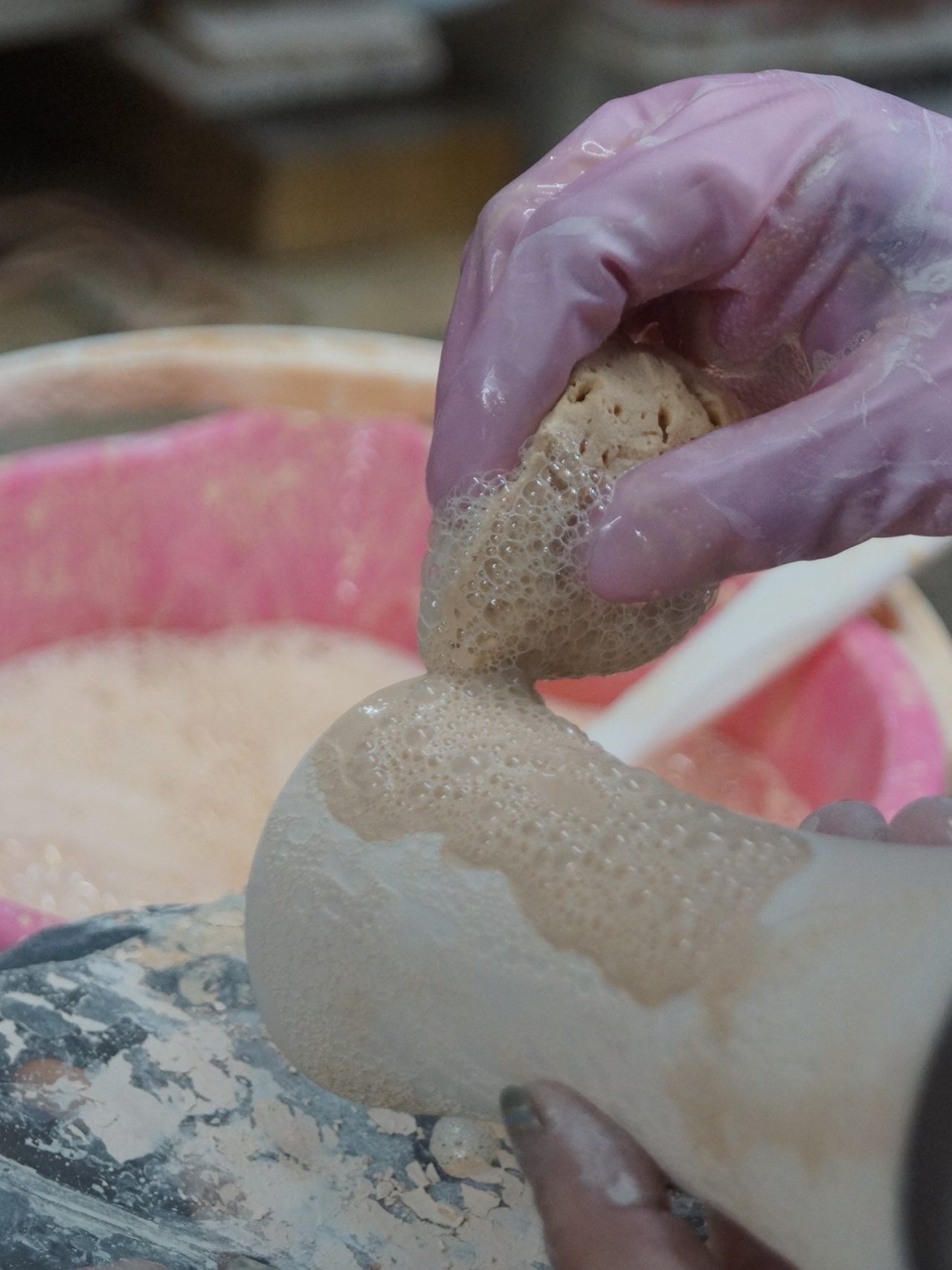 - 泡立った表面の部分をスポンジですくい、うつわの生地に優しく塗布して加飾します。