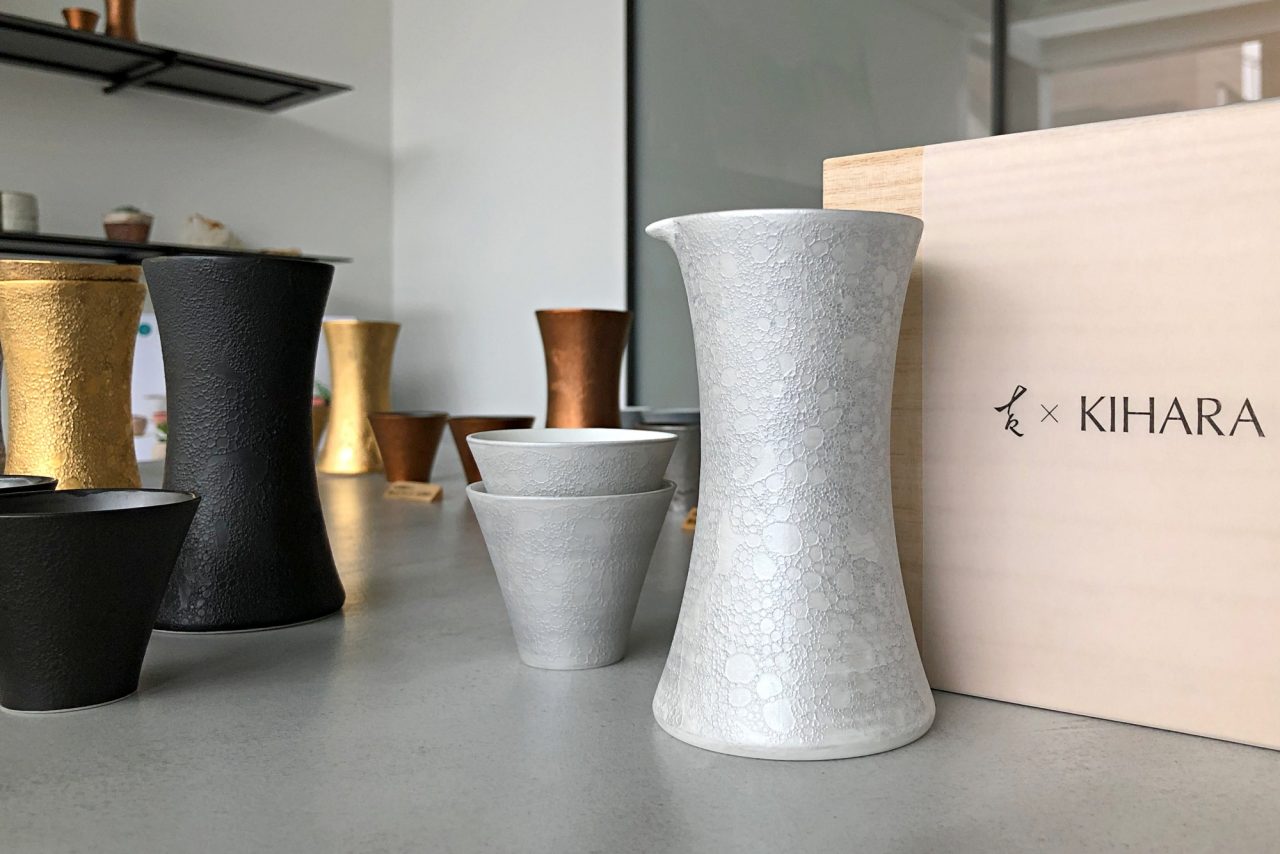 製造過程で破損してしまった素焼きの器を、細かく砕いて粉にし釉薬に混ぜて再利用する加飾法を生み出した吉右ヱ門製陶所の協力のもと進められたプロジェクトでは、KIHARAの定番「GEN酒器」の新仕様を試作しました。展示ではさまざまなバリエーションをご覧いただけます。