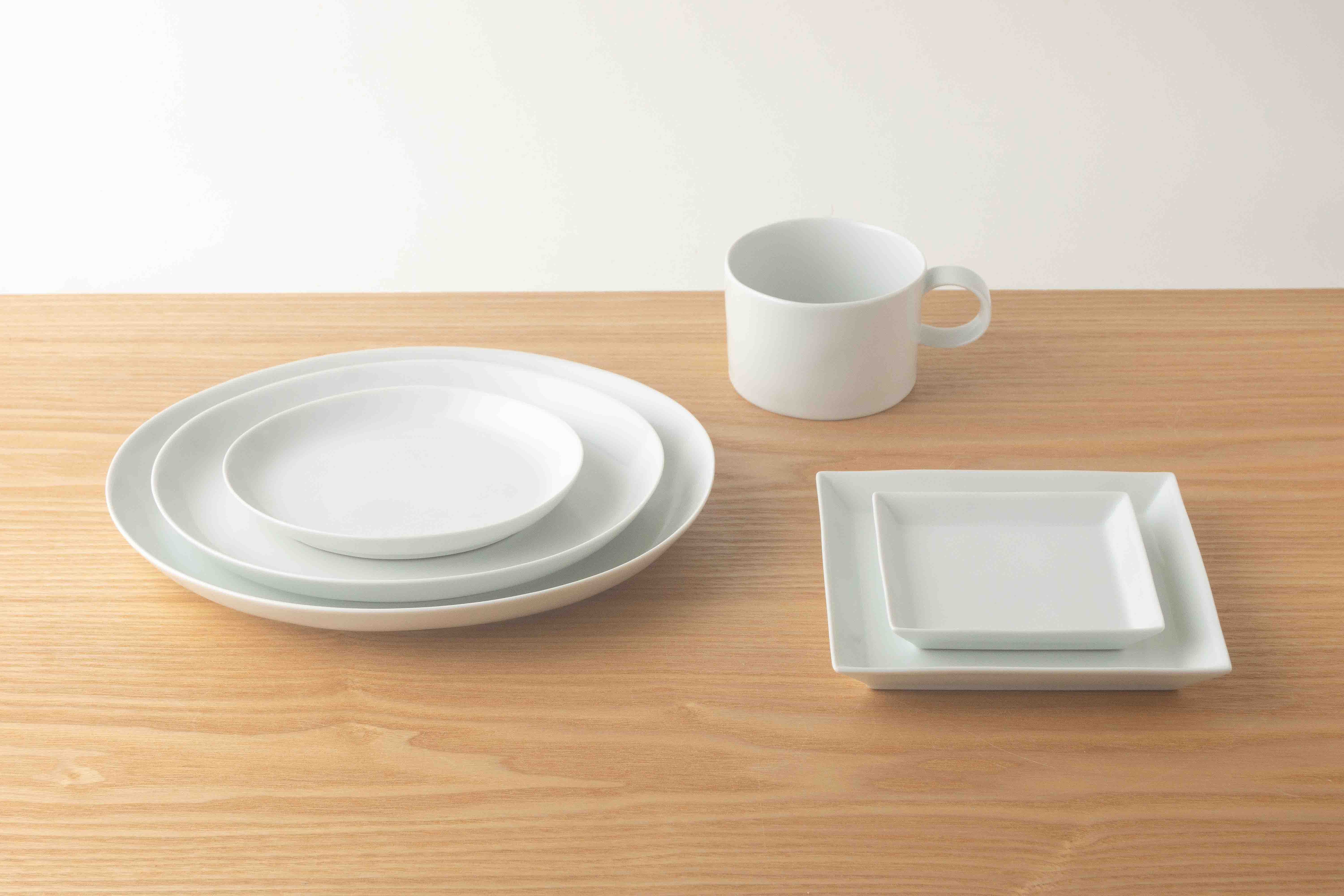 楕円形のプレート(3サイズ)、角皿プレート(2サイズ)とマグカップからお好きな形状をお選びください。