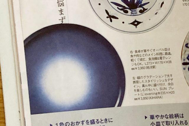 「『プラス絵付け皿』でちょっと上級者の食卓」特集で、どんな料理も受け止めてくれるメイン皿として青色ベースの器が取り上げられており、KIHARAからは「SUNプレート」を紹介いただきました。