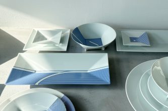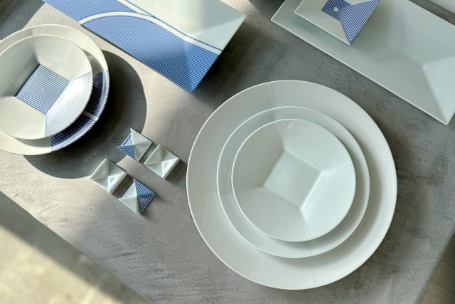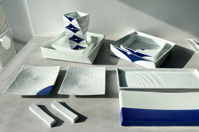 凛とした透明感のある白と、 余白を生かした青いストライプ柄がモダンな川上元美×永井一正デザインの器は「Rin(りん)」と名付けました。有田焼特有の美しい白磁と染付の青を生かした有田HOUENらしさを色濃く反映した代表的なシリーズです。
