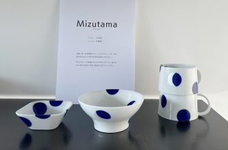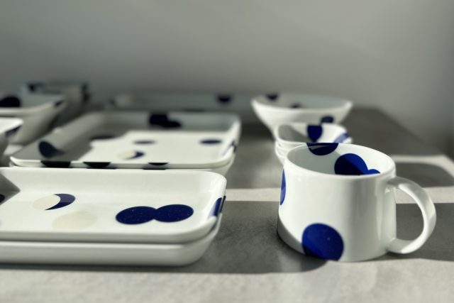 白磁に青い水玉模様をアレンジしたグラフィックなので、シリーズ名は「Mizutama(みずたま)」。わかりやすいモチーフですが、月の満ち欠けのようにも見える粋なデザインに根強い人気があります。