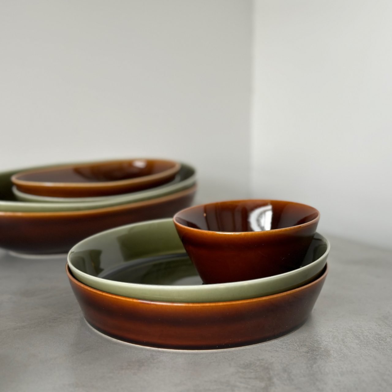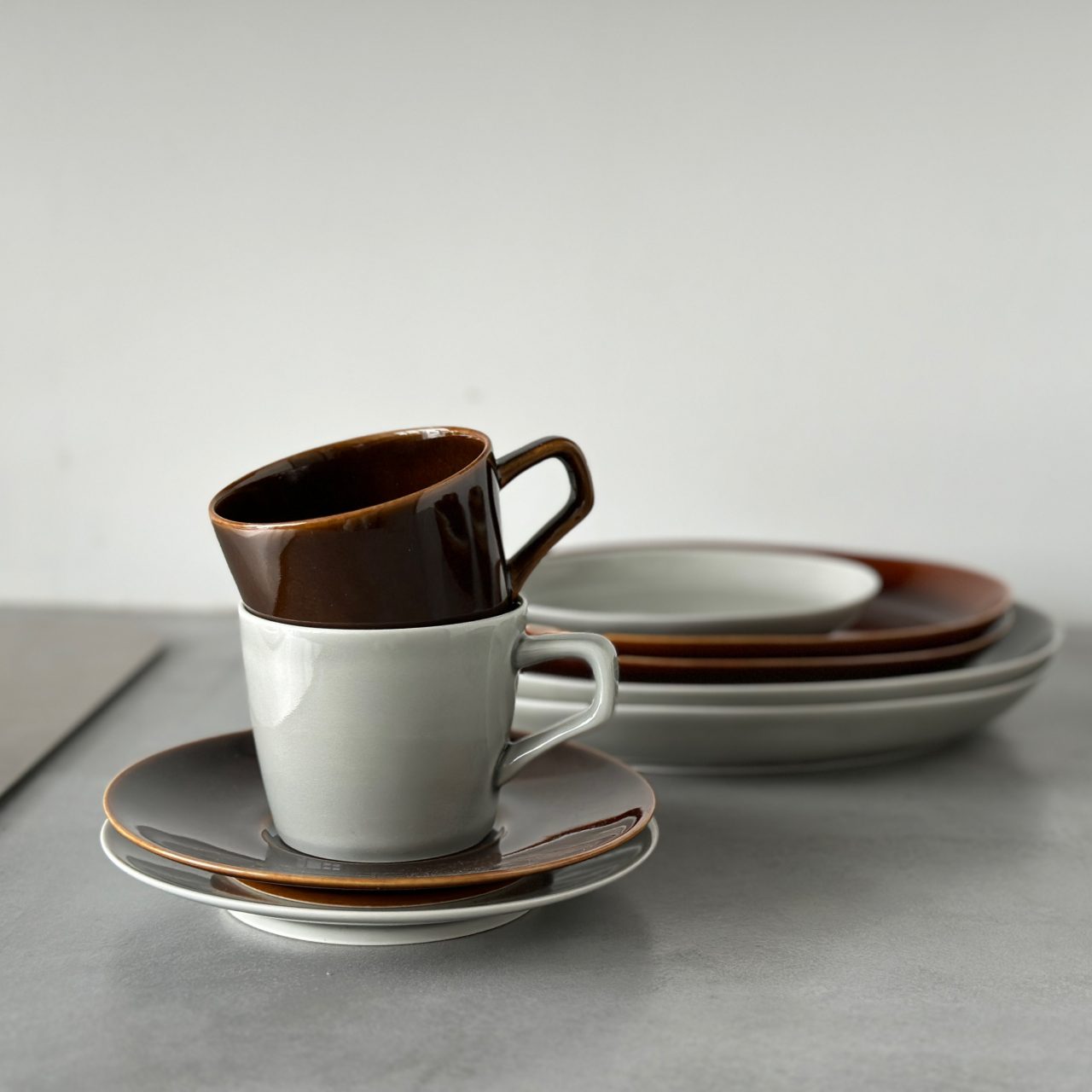 濃い色のアメ釉に淡いベージュを合わせると、メリハリのあるスタイリングに。