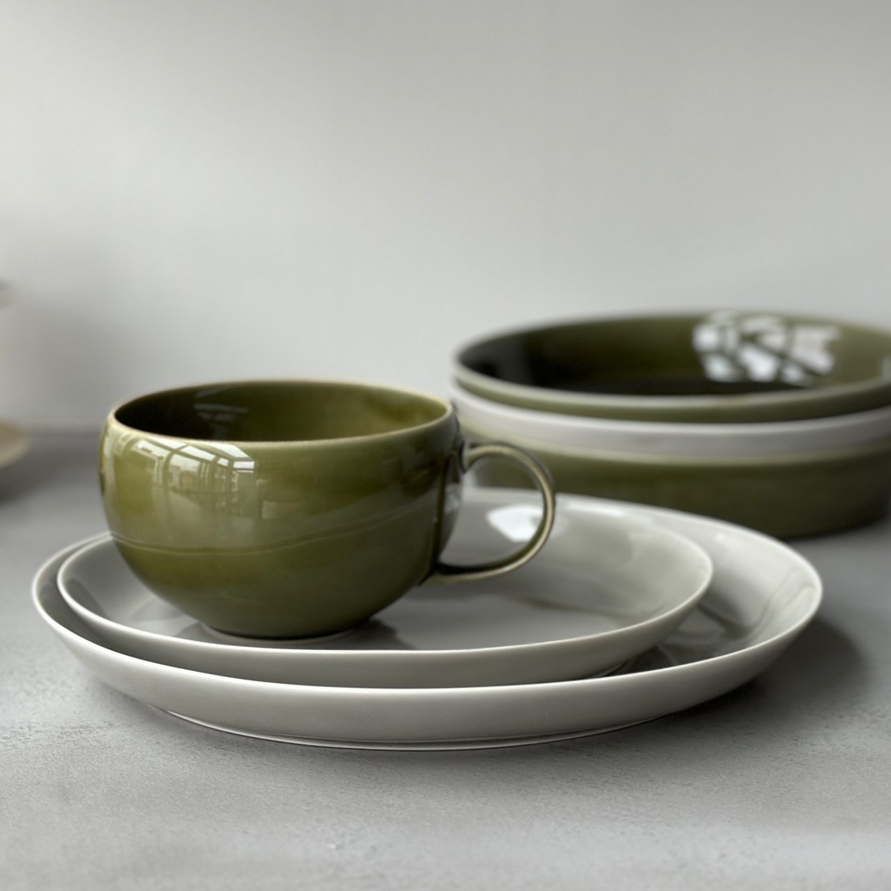 無彩色のグレーに、ダークカラーのオリベやアメ釉を合わせると、シックで大人な印象に。