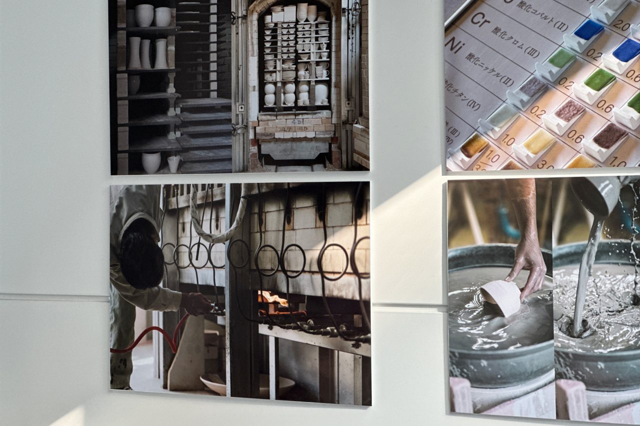 原料となる陶土や釉薬、絵の具、焼成するときの窯の中の位置や温度、気候などによっても仕上がりが変化する繊細な磁器のものづくりを、パネルやスタッフの説明でご紹介しながら、展示をご覧いただきました。