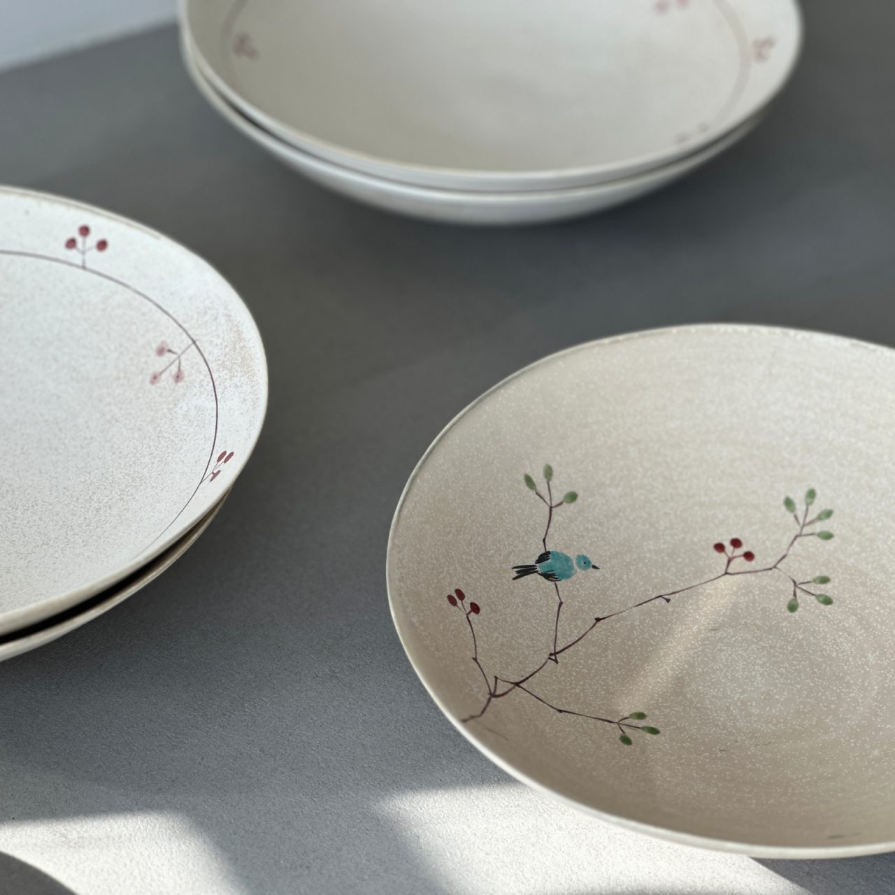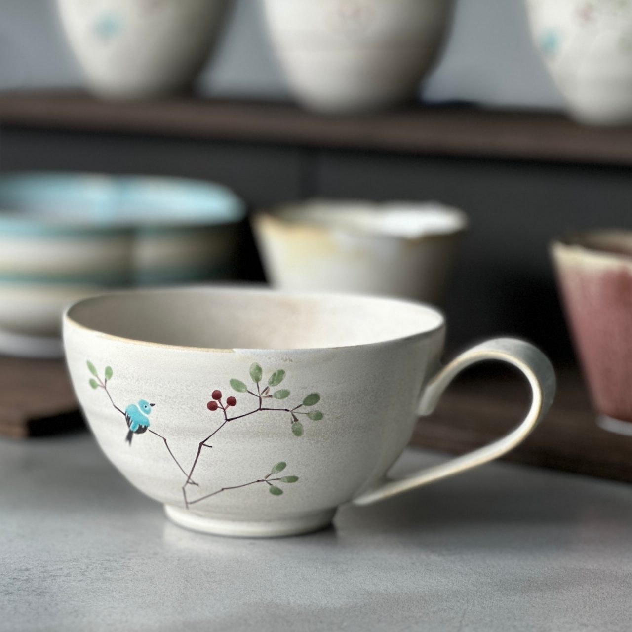 チタン釉を施した趣のある生地に小鳥や木の実を描いた可愛らしい絵付けが人気のシリーズ。 仕上がりの表情や発色など、ひとつとして同じもののない個性が感じられる器です。