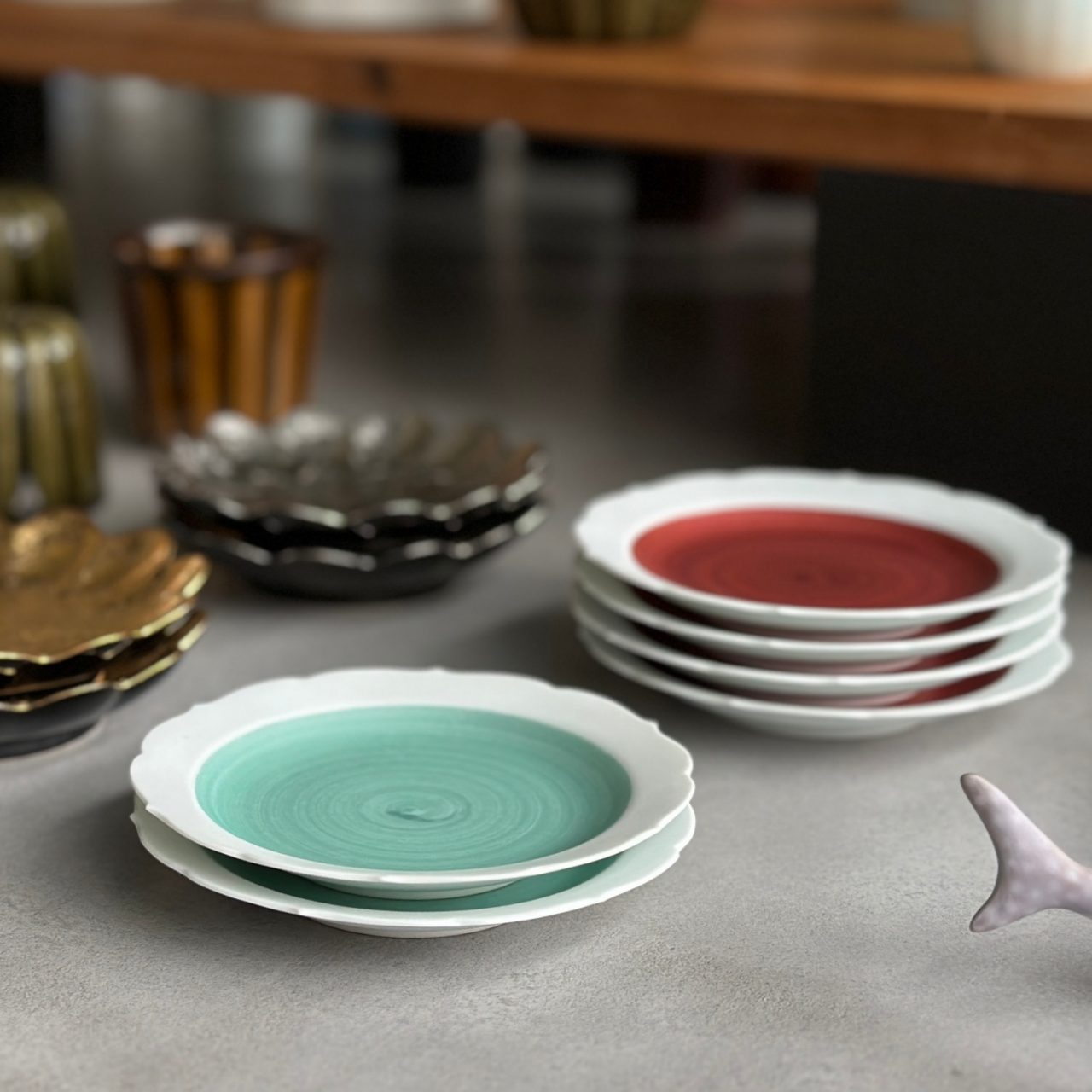 自然が生み出す個体差を表情として楽しむことを提案する企画展「個性を楽しむ器」は、前期・後期で展示を入れ替えてご案内する特別な企画構成となっており、前半はKIHARAの新作を中心に、後半は伊万里・有田焼の窯元13社によるチーム「NEXTRAD」の商品を加え、より多様なものづくりをご覧いただいています。