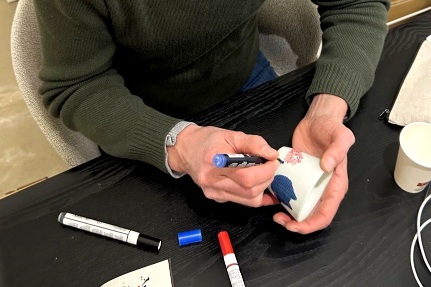発売初日に商品を購入いただいたお客さまには、Jochen直筆のイラストをその場で器に描き足してお渡しするオプション付き。(電子レンジで温めるとある程度定着する特殊なペンを使っています)