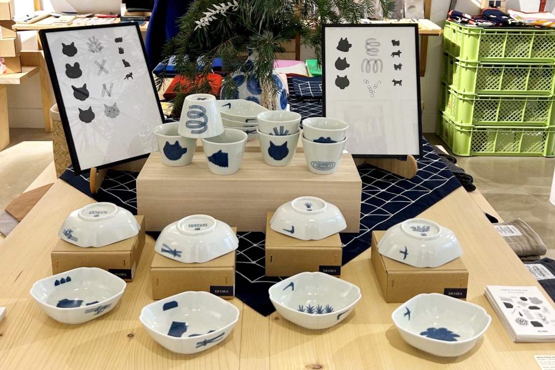 そば猪口には、ネコやイヌ、イノシシ、カエルといった日本の動物、小鉢には、田んぼ、庭木、空き地、アパートなど日本の風景が、抽象化したグラフィックで描かれています。