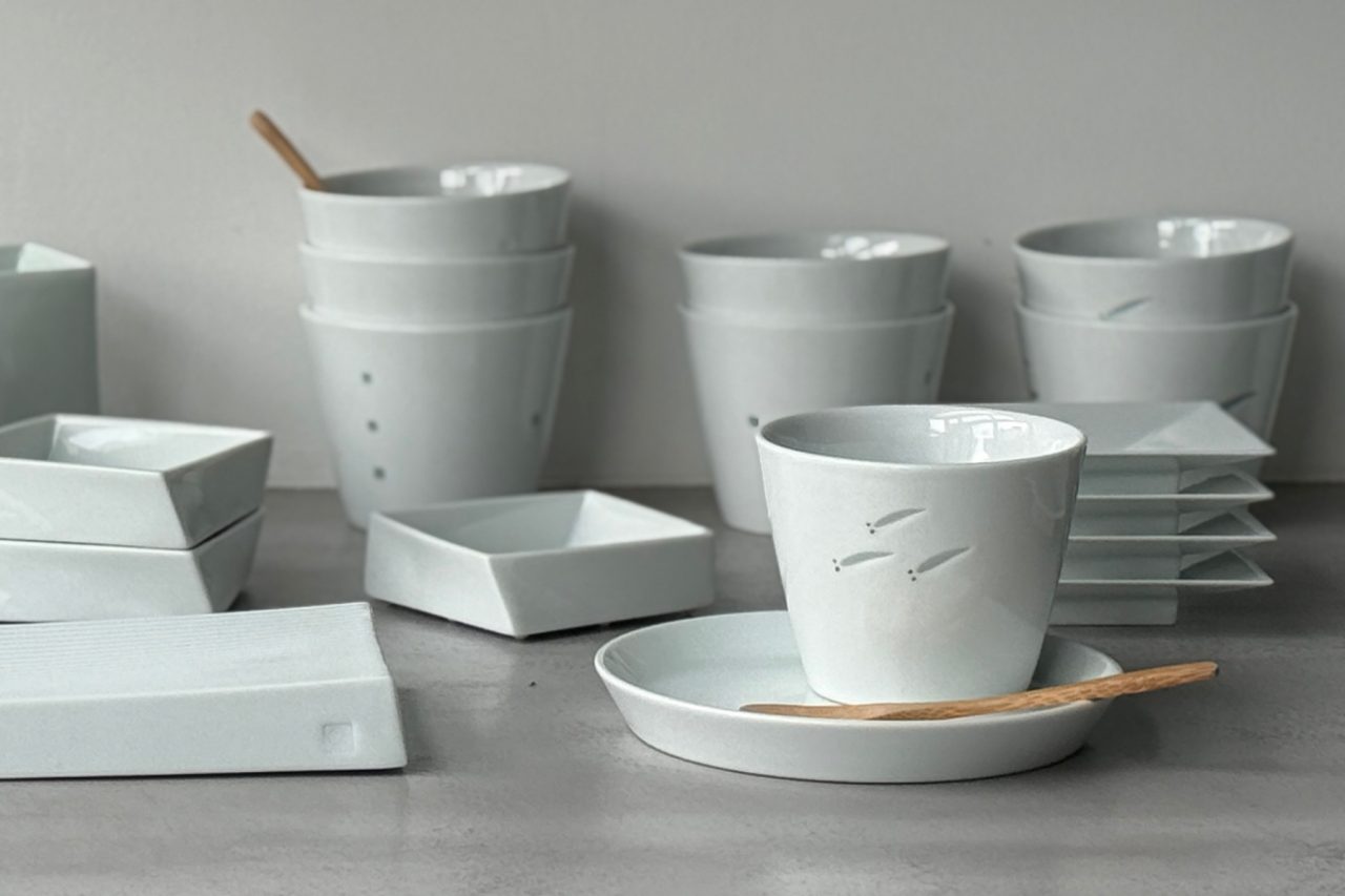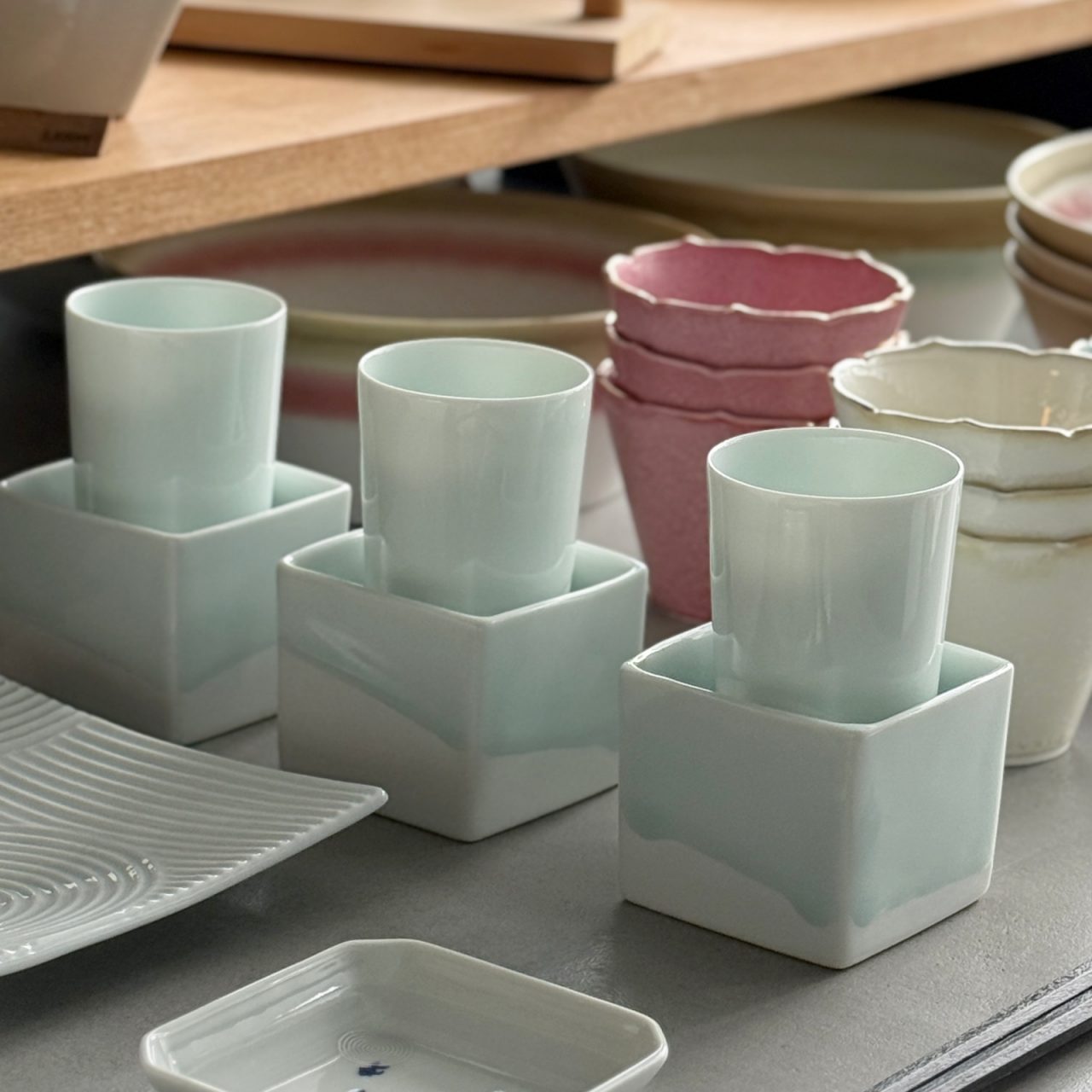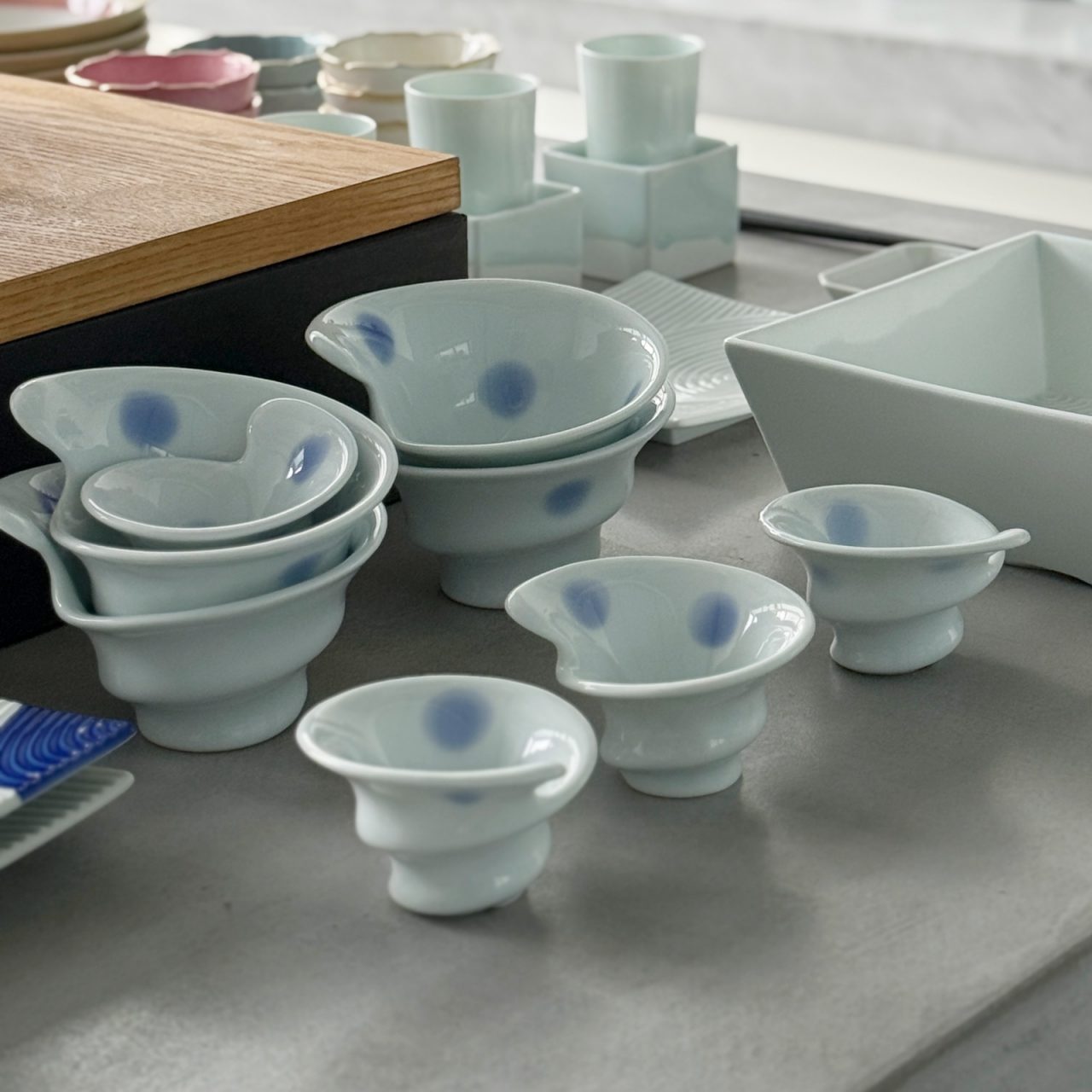 青白の釉薬が爽やかな青白釉流しの桝酒グラスセットや、淡い水玉の小鉢など、夏の晩酌を涼やかに演出する個性的な器もご紹介しています。