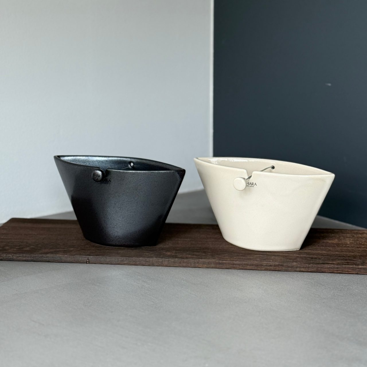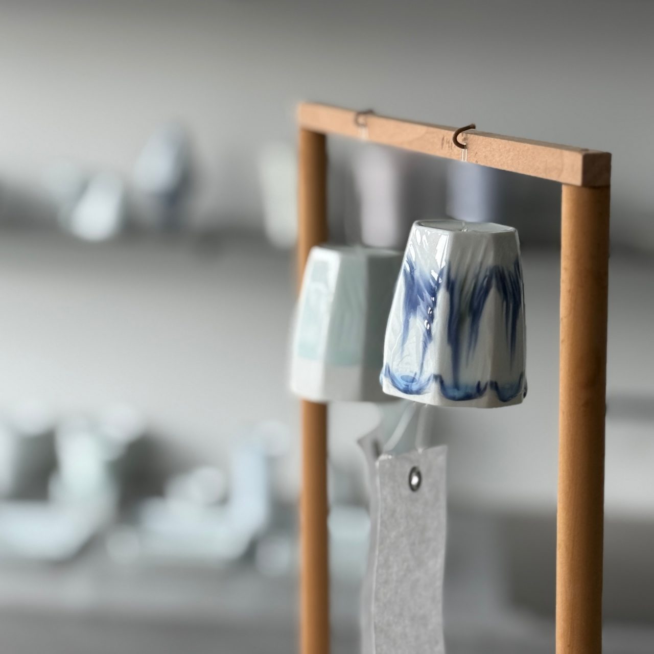 釉薬の流れが美しい2種類の仕上げでご案内しています。心地よい音色にぜひ耳を傾けていただければ嬉しいです。室内展示なので、軽く触れて鳴らしてみてくださいね。
