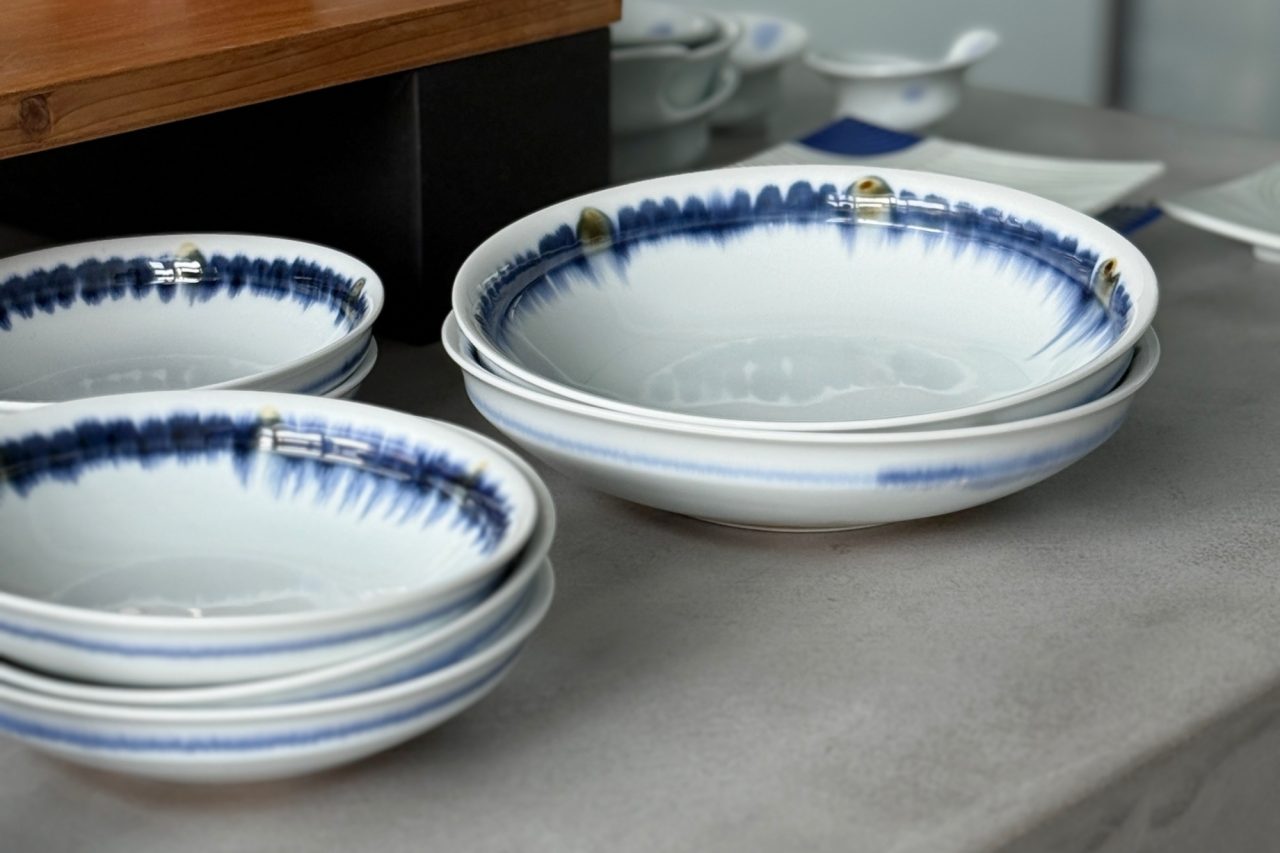 人気の香酒盃からは、にじみやほかしなど柔らかな風合いのある仕上げをセレクト。呉須流しの器とも相性の良い色柄です。