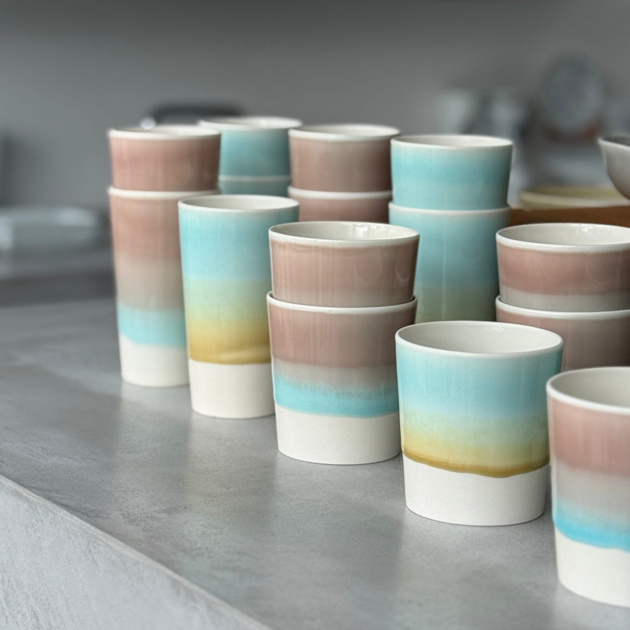 砂浜をイメージさせるベージュからブルーへのグラデーションや、海に沈む夕日をイメージさせる釉薬使いなど、グラデーションをお楽しみいただけるカップや丼鉢が揃います。