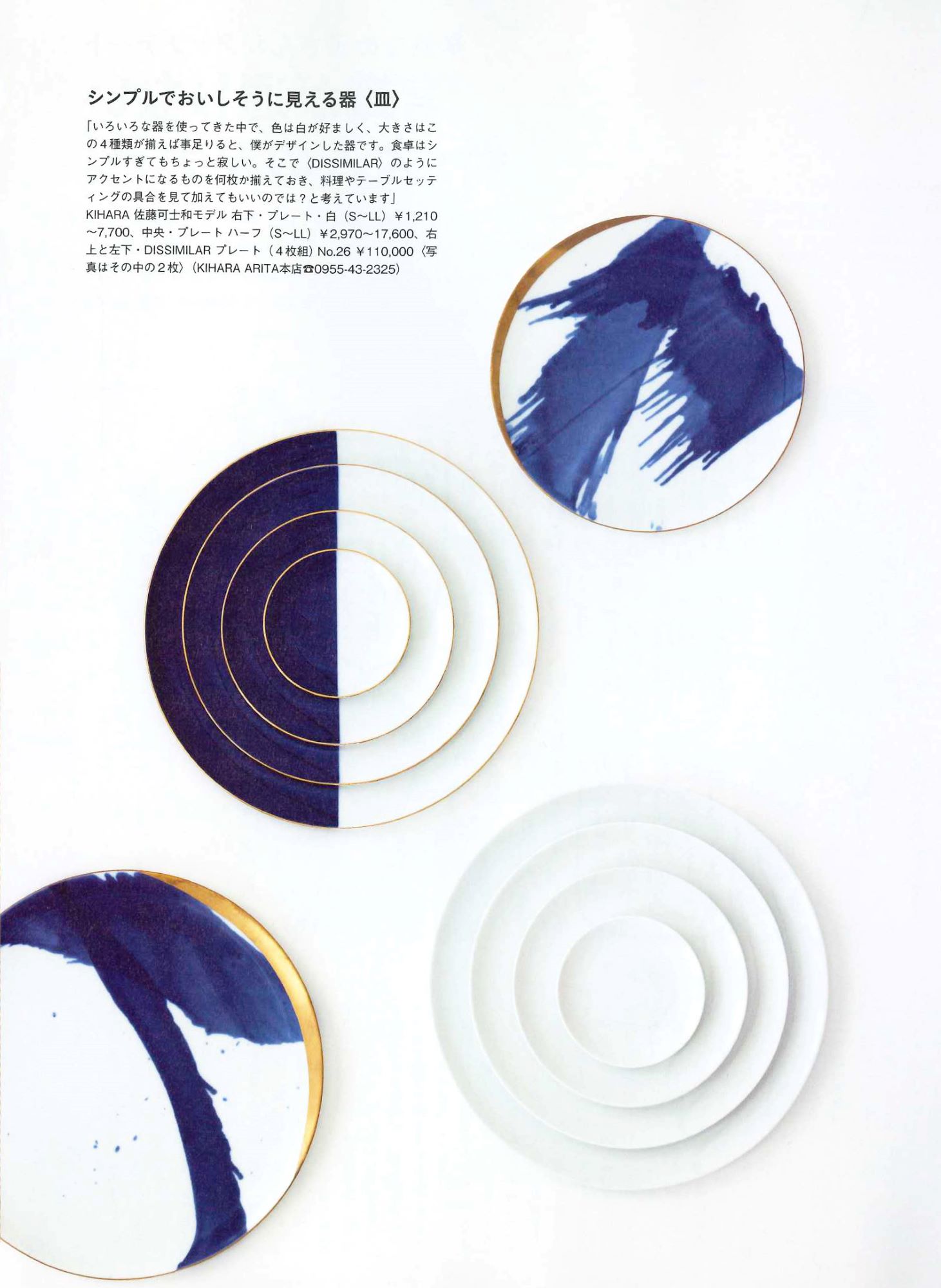 掲載いただいた「佐藤可士和モデルプレート・白」・「佐藤可士和モデルプレート・ハーフ」・「DISSIMILAR 4枚組 No.26」は、究極にシンプルで美しいプロポーションを追求した器です。