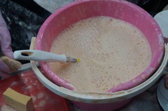 そのままだと、解けない素焼きの粒がまだザラザラするので、そこに釉薬を混ぜて泡だてることで、加飾に使える状態になるのだそう。