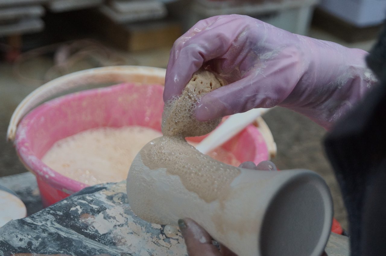 ご協力いただいた有田焼の窯元・吉右ヱ門製陶所で、泡化粧の製造現場を取材した。