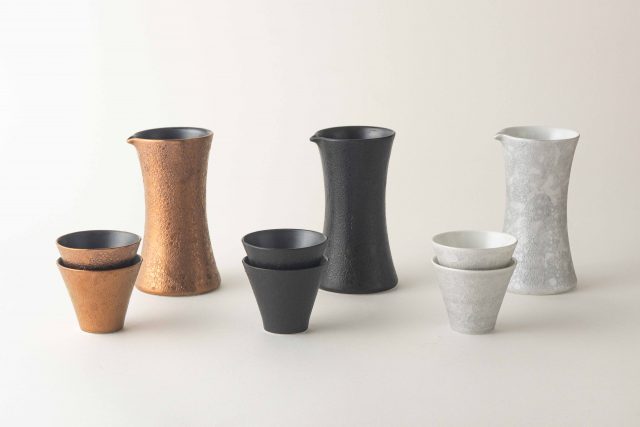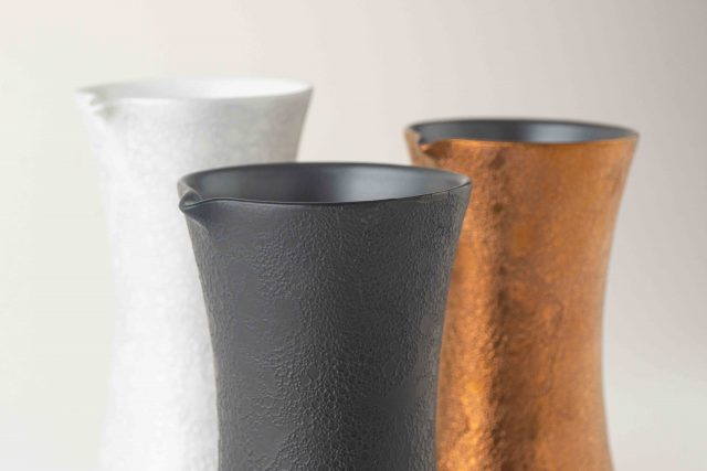 本プロジェクトから商品化された「GEN 酒器 – 泡化粧」は、白・黒・ブロンズの3種類。